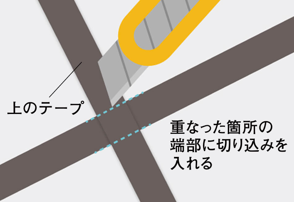 格子状に重ねて使う場合、塗料を塗布する前に上のテープの重なった端部に切り込みを入れておいてください。